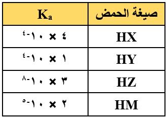 يبين الجدول التالي أربعة محاليل لقواعد ضعيفة متساوية التركيز (1) مول/لتر ومعلومات عنها، ادرسه ثم أجب عن السؤال الذي يليه، علماً بأن (Kw = 1 × 10-14).