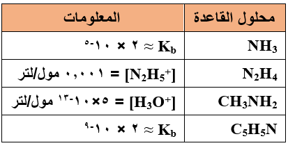 (أهمل تغيّر الحجم، Kb للقاعدة = 1 × 10-5 ، Kw = 1 × 10-14).